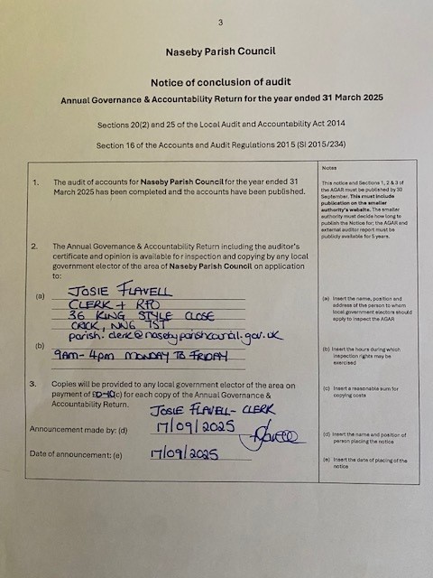 Pursuant to the Accounts and Audit Regulations 2015, members of the public are able to request to review any documentation pertaining to the finances of the council and the audit process. The period for the Exercise of Public Rights for year ending 31st March 2025 took place between the following dates and has now closed: